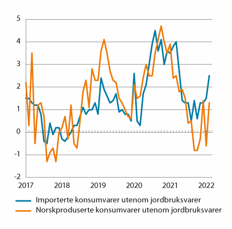 Tolvmånedersveksten i KPI-JAE falt fra 2,7 prosent i januar 2021 til 0,9 prosent i oktober, før den tiltok til 1,8 prosent i desember. I februar 2022 var tolvmånedersveksten i KPI-JAE 2,1 prosent. Tolvmånedersveksten i prisene på importerte konsumvarer (utenom jordbruksvarer) økte fra 3,5 prosent i januar 2021 til 4,0 prosent i mars, før den gradvis avtok til 0,5 prosent i august. Fra oktober og ut året lå tolvmånedersveksten mellom 0,6 og 1,4 prosent. Disse bevegelsene må ses i sammenheng med bevegelser i kronekursen. Kronen har hentet seg gradvis inn etter den kraftige svekkelsen i kjølvannet av koronavirusutbruddet våren 2020, men målt ved den importveide kursindeksen var den likevel svakere i 2021 sett under ett enn i årene før pandemien. Tolvmånedersveksten i norskproduserte varer utenom jordbruksvarer avtok fra 3,9 prosent i januar 2021 til -0,8 prosent i september og oktober, før den gradvis tiltok til 1,4 prosent i desember.