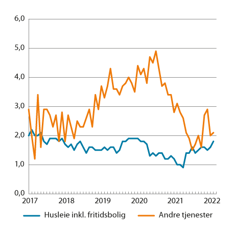 Husleieindeksen i KPI består av betalt husleie og beregnet husleie som skal uttrykke verdien av tjenesten selveiere og andelseiere får av boligen sin. Prisene på denne tjenesten antas å følge utviklingen i leieprisene på tilsvarende boliger i leiemarkedet. Figur 3.5 viser utviklingen i husleiene inkludert fritidsbolig. Fra 2020 til 2021 steg husleiene med 1,3 prosent, mot en vekst på 1,5 prosent i 2020. Tolvmånedersveksten i husleiene holdt seg mellom 0,9 prosent og 1,6 prosent gjennom fjoråret. Prisene på andre tjenester steg med 2,3 prosent i 2021, etter en økning på 4,1 prosent i 2020. Tolvmånedersveksten holdt seg mellom 1,5 og 3,1 prosent.