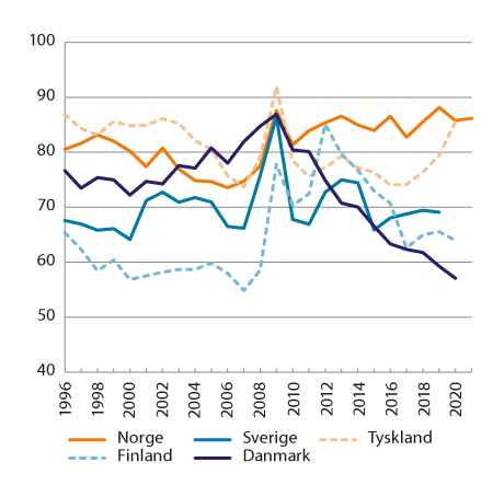 Figur 4.1 viser også utviklingen i Sverige, Tyskland, Finland og Danmark. Når man sammenligner lønnskostnadsandelen med andre land, er det viktig å være oppmerksom på at ulik næringsstruktur i ulike land vil kunne gi nivåforskjeller i lønnskostnadsandelene mellom landene. I vedleggstabell 4.5 presenteres tall for netto lønnskostnadsandel for industrien i Norge og utvalgte land.