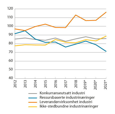Ressursbaserte industrinæringer | 91,5 | 94,9 | 85,4 | 81,5 | 81,9 | 76,1 | 79,5 | 83,0 | 78,8 | 71,2 | 82,4 | 80,3 |