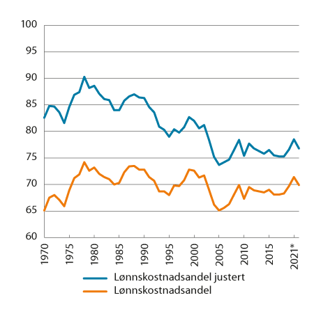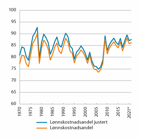 Lønnskostnadsandelen for konkurranseutsatt industri har fulgt samme mønster. Gjennomsnittlig lønnskostandsandel for årene 1970–2021 var 82,2 prosent og om lag det samme de siste 20 årene. Som påpekt i Berg mfl. (2020), er de årlige endringene i andelene i stor grad drevet av endringer i driftsresultatet og ikke endringer i lønnskostnader.