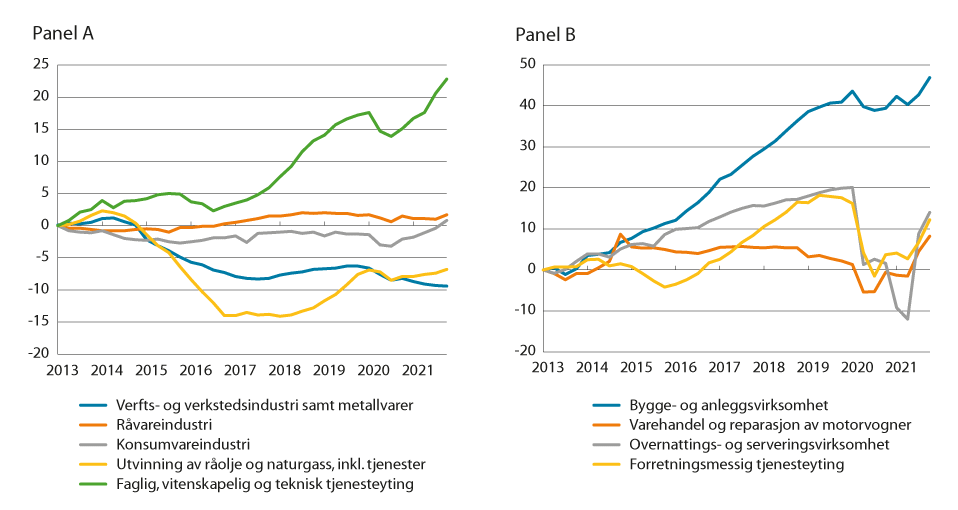 Sysselsettingsutviklingen etter næring i årene 2016 til 2021 er vist i tabell 7.1 og figur 7.2.2 Flere år med nedgang i sysselsettingen innen utvinning av råolje og naturgass snudde til en liten økning fra slutten av 2018, før et fall i 2. og 3. kvartal 2020. Siden den gang har det vært noe økning i sysselsettingen igjen. En tilsvarende utvikling fant også sted i verfts- og verkstedindustrien, men her har nedgangen fortsatt gjennom 2021. Samlet sett for industrien økte sysselsettingen jevnt fra 2017 og fram til 2. kvartal 2020, hvor sysselsettingen falt som følge av redusert etterspørsel og ordretilgang fra utlandet i forbindelse med koronapandemien. Fra 4. kvartal 2020 tok sysselsettingen seg noe opp igjen, og med noe videre økning gjennom 2021, spesielt i 4. kvartal. Dette er vist i panel A i figur 7.2.