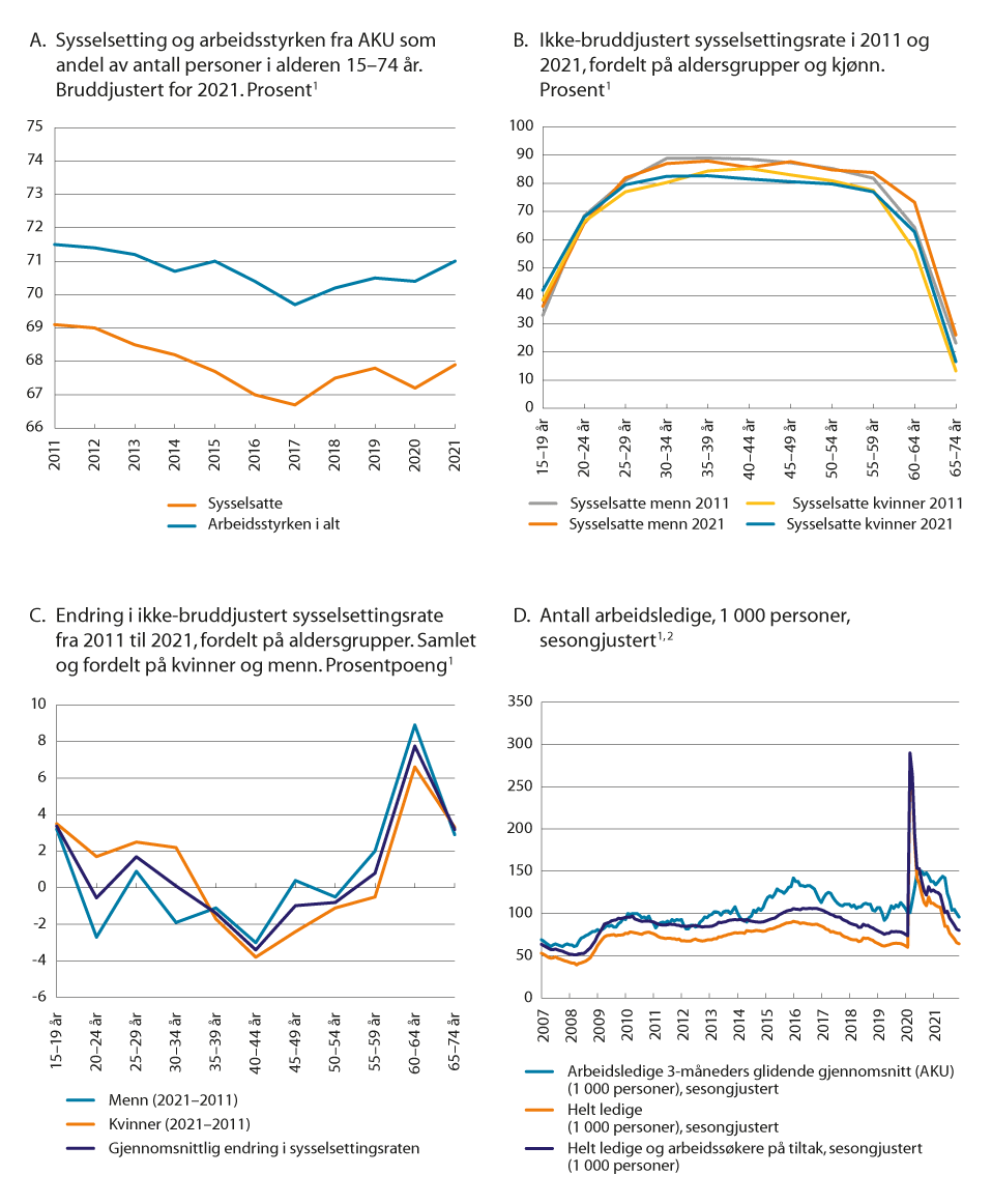 Sysselsettingsraten og yrkesdeltakelsen målt ved Arbeidskraftundersøkelsen (AKU) økte med henholdsvis 0,7 og 0,5 prosentpoeng fra 2020 til 2021. Brudd- og sesongjusterte månedstall fra AKU viser at sysselsettingsraten og yrkesdeltakelsen i slutten av 2021 var på henholdsvis 69,0 og 71,5 prosent.