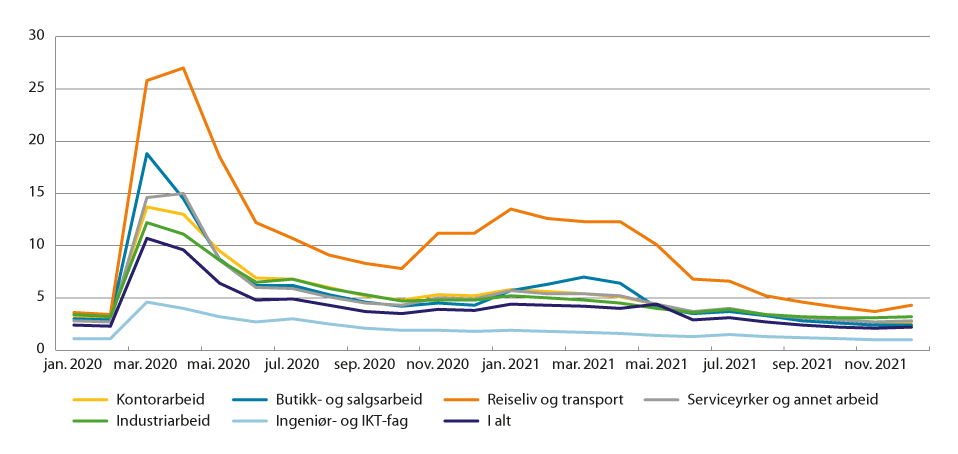 Det er yrkene som har vært mest direkte berørt av smitteverntiltakene som har opplevd den største økningen i arbeidsledighet i 2020 og 2021. Dette er yrker med overrepresentasjon av lav lønn, slik at sosiale skjevheter ble forsterket. I kjølvannet av den første nedstengingen i mars 2020 var ledighetsøkningen spesielt stor for reiseliv og transport, samt butikk- og salgsarbeid (se figur 7.5). Ved den andre smittebølgen i slutten av 2020 og starten av 2021 økte arbeidsledigheten innen reiseliv og transport fra 7,8 prosent i oktober 2020 til 13,5 prosent i januar 2021. Fra og med mai 2021 og utover falt arbeidsledigheten innen denne yrkesgruppen betraktelig, til 2,8 prosent i desember 2021. Under den andre smittebølgen var ikke økningen i andelen helt ledige innen butikk- og salgsarbeid like stor, og falt fra en topp på 7,0 prosent i mars 2021 til 2,4 prosent i desember 2021. Innenfor industriarbeid har andelen registrert som helt ledig falt jevnt, fra en topp på 12,2 prosent i mars 2020 til 3,2 prosent i desember 2021. Ingeniør- og IKT-fag har jevnt over hatt en lav andel helt ledige, med et gjennomsnitt på 1,4 prosent gjennom 2021.