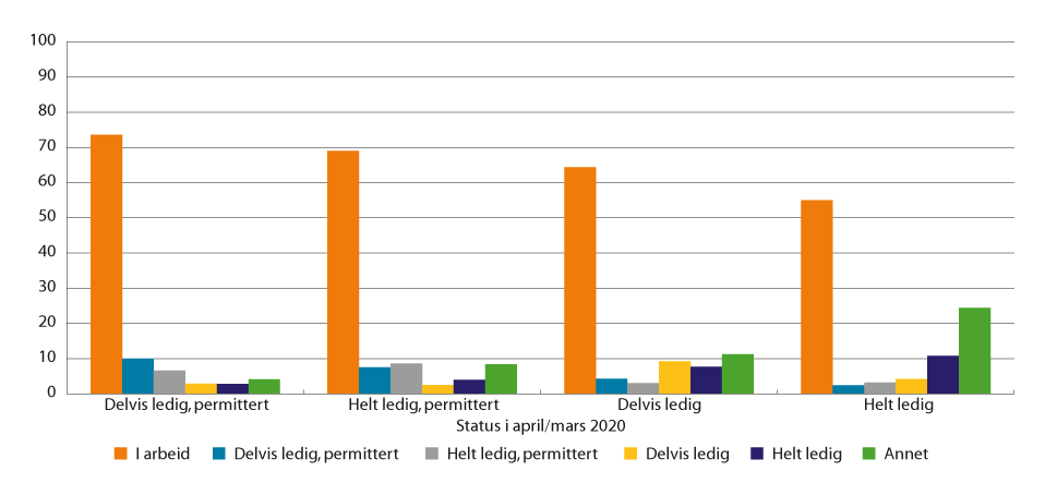 Personer som var registrert som arbeidsledige hos NAV under den første nedstengningen i mars/april 2020 har i stor grad kommet tilbake i jobb ett år senere, vist ved de oransje vertikale stolpene i figur 7.6. Figuren viser at andelen varierer på tvers av statusen i mars/april, hvor 73,6 prosent av de delvis ledige permitterte er tilbake i jobb ett år senere, mens 55,0 prosent av de helt ledige er tilbake i jobb ett år senere. Dette er som forventet, da permitterte i høy grad beholder tilknytningen til arbeidsmarkedet gjennom en arbeidsgiver.