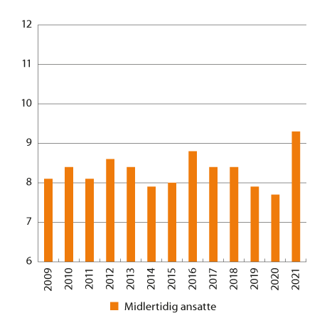 2 Nivået for 2021 viser midlertidig ansatte i prosent av alle ansatte. Nivået for 2021 er ikke bruddjustert og dermed må endringen fra 2020 til 2021 tolkes med varsomhet, se kapittel 7.5 for mer om bruddet.