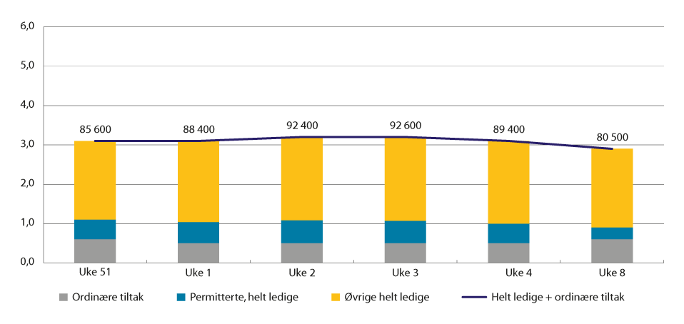 Figur 7.8 Utvikling i arbeidsledighet (helt ledige) og personer på ordinære tiltak. Prosentandel av arbeidsstyrken og antall personer, uke 51 i 2021, uke 1–4 og uke 8 i 2022 (ikke sesongjustert)