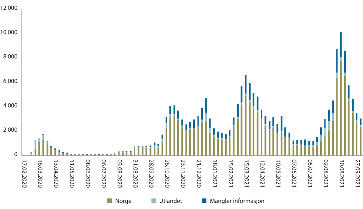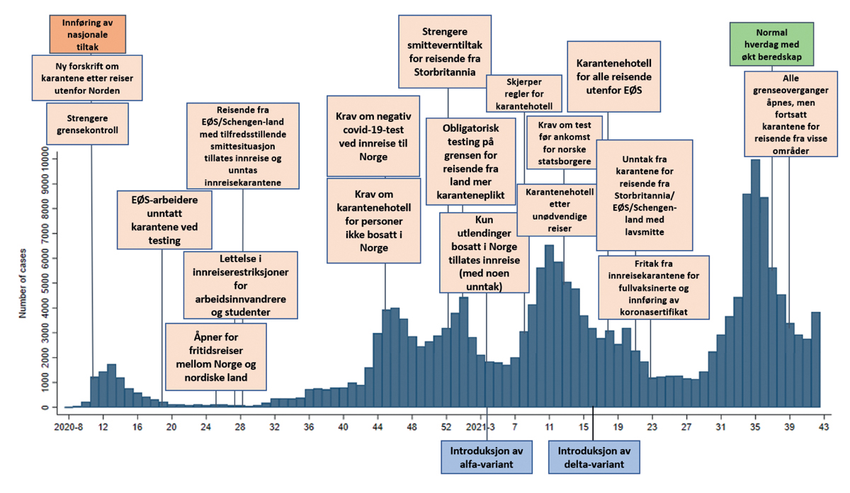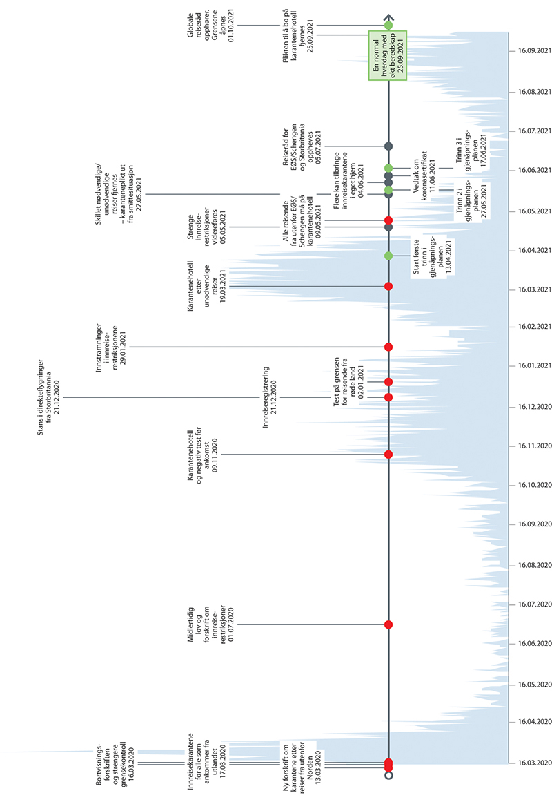 Myndighetene har som nevnt benyttet innreiserestriksjoner og innreisekarantene som smitteverntiltak siden våren 2020. På ulike stadier i pandemien har det vært innført forskjellige tiltakspakker som har bestått av blant annet reiseråd, innreiserestriksjoner og krav til innreisekarantene. Norge stengte mer eller mindre grensene våren 2020. Deretter fulgte en gjenåpning utover sommeren 2020, nye tiltak høsten 2020 og kraftige innstramninger vinteren 2021. En ny gradvis gjenåpning fulgte våren og sommeren 2021. Figuren nedenfor viser viktige tiltak mot importsmitte, slik FHI har presentert det.