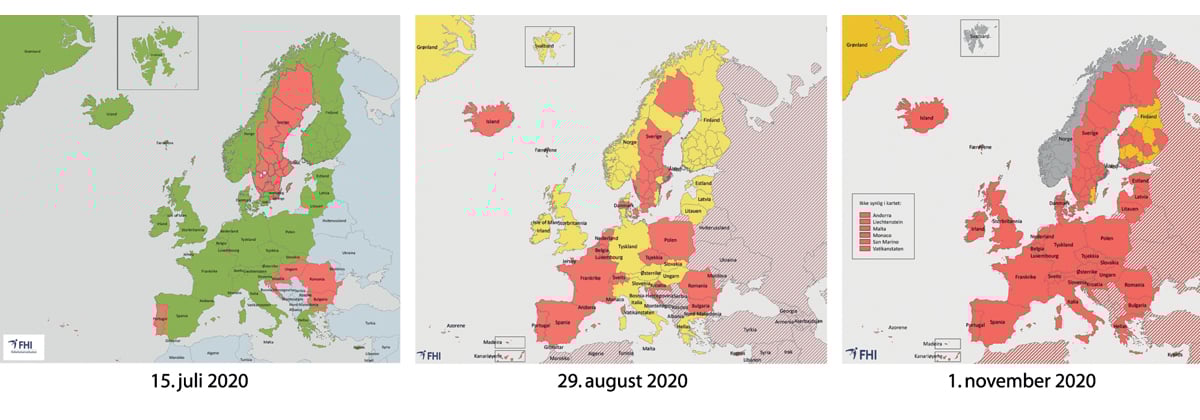 Med virkning fra 15. juli 2020 ble det gjort ytterligere lettelser i innreiserestriksjonene. Personer som var bosatt i Schengen- og EØS-området, fikk da reise inn til Norge dersom landet de kom fra, hadde lite smitte.20 De var da heller ikke underlagt karanteneplikt etter innreise. Fra og med juli 2020 ble det benyttet et fargekart som veileder til karantenereglene ved reiser i Europa. Personer som ankom fra «røde områder», hadde karanteneplikt, mens personer som ankom direkte fra «grønne områder», fikk unntak fra karanteneplikten. Reisende risikerte imidlertid at kartet ble endret mens de var på reise.