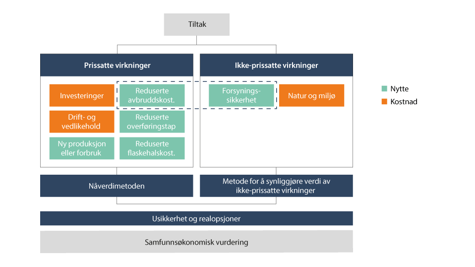 Figur 11.1 illustrerer elementer i samfunnsøkonomisk analyse av nettanlegg, inkludert eksempler på hva som inngår av både prissatte og ikke-prissatte virkninger. Prissatte virkninger er investeringskostnadene, samt kostnader til drift og vedlikehold. Nytten er særlig relatert til tilknytning av forbruk/produksjon, samt reduksjon i avbruddskostnader, overføringstap og flaskehalskostnader. Disse verdsettes ved hjelp av nåverdimetoden.