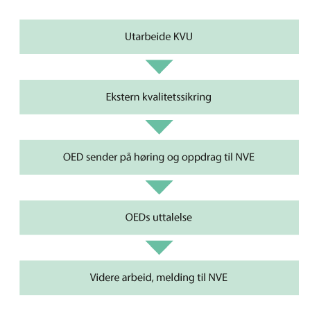NVEs rolle i KVU-prosessen er ikke regulert eller omtalt eksplisitt. Departementets praksis har imidlertid vært å sende et oppdrag til NVE samtidig med høringen, der NVE bes om å vurdere KVUen mv. NVE har svært viktig kompetanse og forutsetninger for å gi en kvalifisert uttalelse til KVUen, og departementet vektlegger NVEs vurderinger.