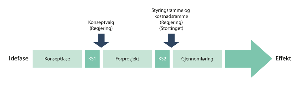 En overordnet inndeling i fire prosjektfaser legges til grunn: idefase, konseptfase, forprosjekt og gjennomføring. Ordningen omfattet i begynnelsen en kvalitetssikring av forprosjektets styringsunderlag og kostnadsoverslag som gjennomføres før investeringsbeslutning, det som i dag omtales som KS2. I 2005 ble ordningen utvidet med et nytt kontrollpunkt, kvalitetssikring av konseptvalgutredningen (KVU), det vil si KS1. Kravene innebærer at prosjektene skal gjennomgå ekstern kvalitetssikring før beslutningsunderlaget legges fram for regjeringen og Stortinget. Ordningen legger til rette for god metodisk utredning før det fattes beslutninger om statlige investeringer. Målet er å unngå feilinvesteringer og holde god kontroll med kostnader og nytte gjennom planlegging og gjennomføring av prosjektene og på den måten sørge for en mest mulig effektiv bruk av fellesskapets ressurser. Prosessen for statens prosjektmodell er illustrert i figur 11.3.