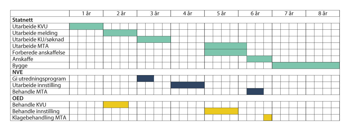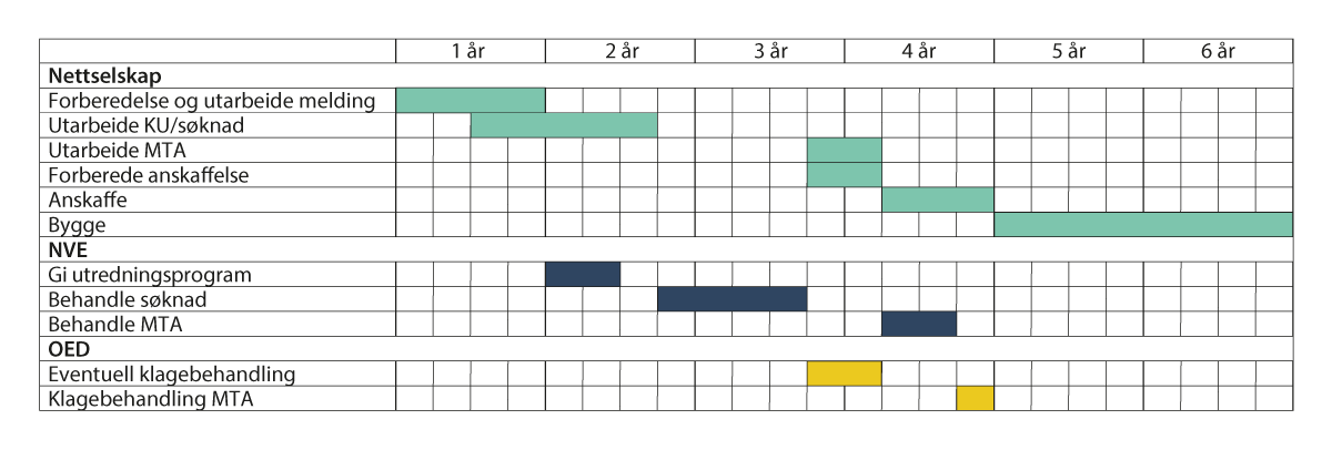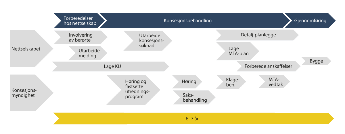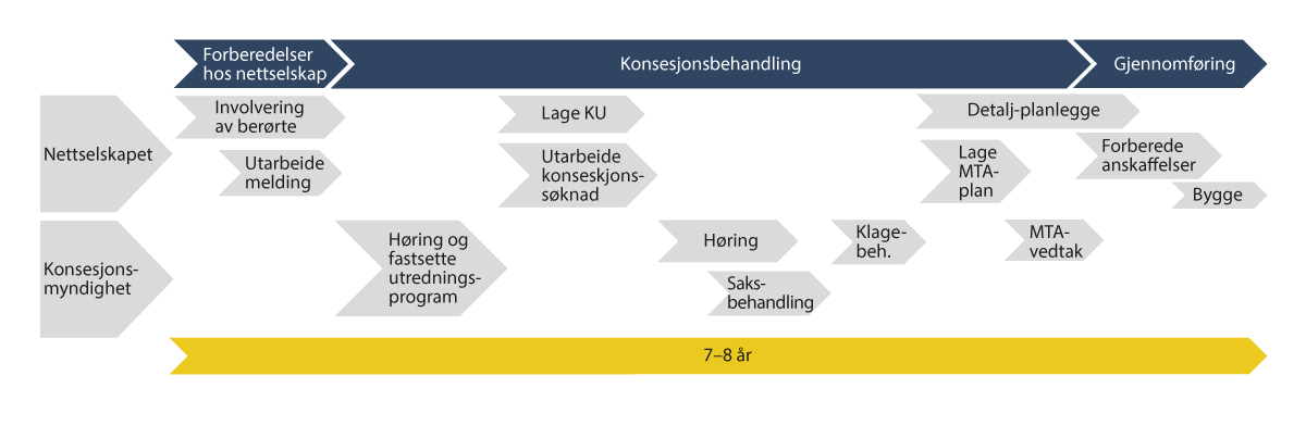 Det er særlig når det er behov for større ledninger i regional- og transmisjonsnettet at nettutbyggingen tar lengre tid å bygge ut enn nytt kraftforbruk eller -produksjon. Ettersom konsesjonsprosessen er differensiert, vil store anlegg ha en mer omfattende prosess. Se mer om dette i kapittel 10.6.