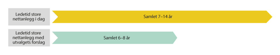 Figur 13.5 illustrerer ledetider i nettutviklingen fra behov oppstår til en stor kraftledning er satt i drift, i dag og med utvalgets forslag. Samlet ledetid i dag er anslått til 7–14 år for saker som følger saksgang B og C. Denne kan reduseres med 1–6 år, dvs. en samlet ledetid på 6–8 år etter tiltak, jf. figur 13.3 og 13.4. Fordelingen i tidsbruk er usikre anslag.