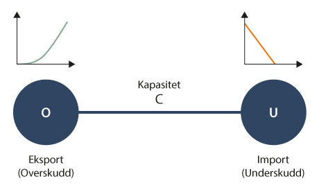 I det følgende vil vi illustrere betydningen av flaskehalser i et enkelt eksempel. Vi antar at vi har to punkter (eller noder), ett med netto produksjon (O) og ett med netto forbruk (U), og begrenset overføringskapasitet (C) mellom punktene, se figur 1.1. Vi ser for enkelhets skyld bort fra nett-tap.2