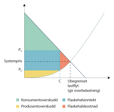 I det norske kraftsystemet blir flaskehalser i regional- og transmisjonsnettet som ikke løses ved bruk av budområder, normalt håndtert i regulerkraftmarkedet. Av figur 1.2 ser vi at fastsettelsen av overføringskapasiteten C vil påvirke både priser og fordeling av overskudd. C kan for eksempel bestemmes slik at flaskehalsinntekten, heller enn samfunnsøkonomisk overskudd, maksimeres, og dette er en grunn til å regulere nettselskapene slik at flaskehalsinntekten ikke bestemmer nettselskapets overskudd.