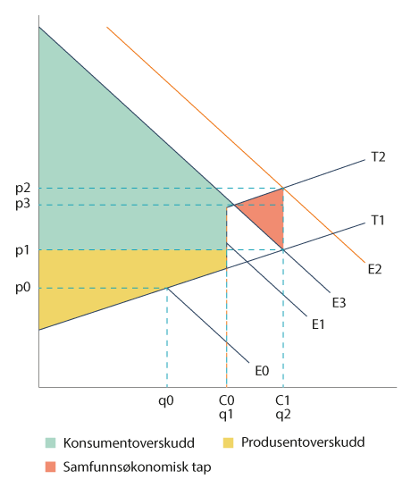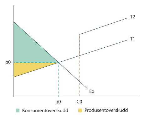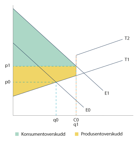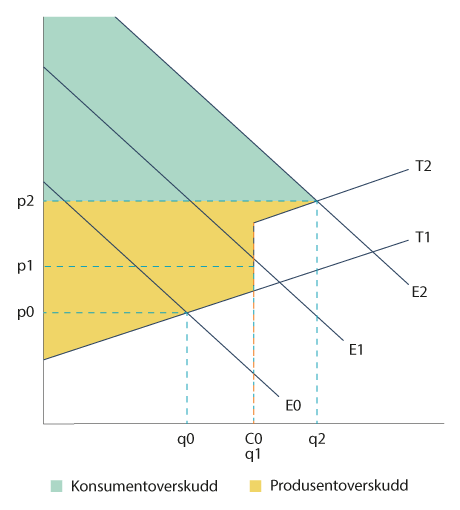 I figur 1.3 er kostnaden av å tilby elektrisitet angitt av T1. Etterspørselen etter strøm er gitt av E0. Fram til kapasitetsgrensen, C0, er det T1 som angir tilbyders kostnader ved å tilby elektrisitet. Nye investeringer innebærer imidlertid store faste kostnader, og for å øke forbruket over den eksisterende kapasitetsgrensen C0 må det gjøres investeringer. Kostnaden ved dette er angitt av differansen mellom T1 og T2. I figuren er det samfunnsøkonomiske overskuddet ved tilpasning under eksisterende kapasitetsgrense summen av produsentoverskuddet og konsumentoverskuddet.