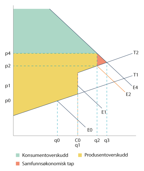Anta at vi igjen har bygd ut en kapasitet lik q2 men at etterspørselen nå blir større og lik E4, se figur 1.7. Det ville ha vært lønnsomt å bygge ut kapasiteten q3, men siden kapasiteten bare er lik q2, må prisen settes lik p4. Da ser vi at vi lider et samfunnsøkonomisk tap lik den røde trekanten ved at vi har bygget ut for lite kapasitet.
