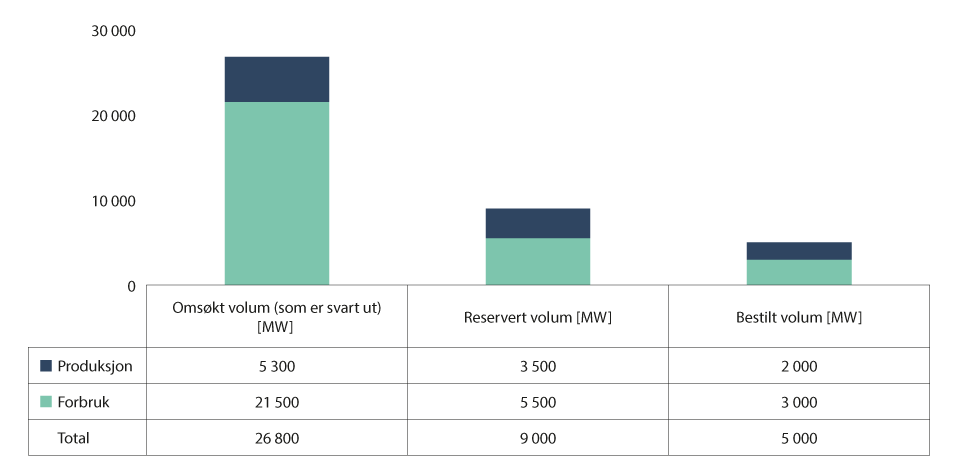 De siste årene har det vært stor vekst i etterspørsel etter tilknytning til strømnettet fra forbrukskunder. Statnett viser til at det i perioden 2010–2018 var en typisk forbruksvekst på under 1 pst. per år, mens det siden 2019 har vært en årlig vekst på 5–10 pst. i enkelte regioner (Statnett, 2021). Figur 4.1 viser volum av forespørsler i ulike stadier som Statnett har behandlet siden 1. januar 2018. I figuren er omsøkt volum søknader som har kommet inn og hvor nettselskapet har gitt aktøren en første tilbakemelding. Reservert volum er søknader som er behandlet og der aktøren har fått tilbakemelding om at det er kapasitet i dagens nett og mottatt tilbud om tilknytning. Bestilt volum er prosjekter som har takket ja til tilbud om tilknytning. Til sammenligning er forbruksrekorden i det norske kraftsystemet 25 230 MWh/h1 (Statnett, 2022). Prognosene for framtidig etterspørsel er beheftet med usikkerhet, og det er sannsynlig at prosjekter kan være registrert flere ganger, blant annet som følge av at de samme prosjektene kan være innmeldt til flere nettselskap på samme tid. Likevel indikerer tallene stor etterspørsel, som det ikke er kapasitet til å tilknytte i eksisterende nett. Prissignaler kan bidra til å i større grad avdekke den faktiske etterspørselen framover.