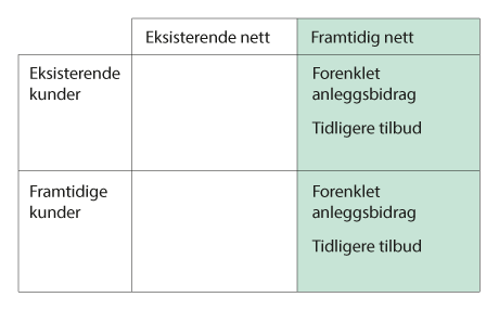 Gitt at anleggsbidrag og betaling for nettutredning utgjør øvre ramme for kostnader, vil innføring av en reservasjonspris i tillegg til dette kun være en omfordeling i tid av de totale kostnadene kunden skal dekke. Utvalget ser det derfor ikke som formålstjenlig å innføre et nytt prissignal for å reservere kapasitet i framtidig nett, utover det kunden allerede må betale gjennom anleggsbidrag og betaling for nettutredning.