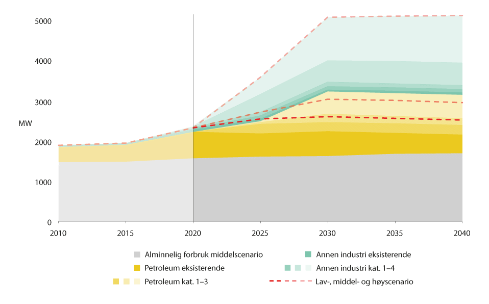 På bakgrunn av mange planer for nytt kraftbehov i Bergen og omland har Statnett utført en konseptvalgutredning for framtidig nettutvikling i området. På bakgrunn av kjente planer har Statnett laget tre scenarioer for forbruksutviklingen, høy, middel og lav. Se figur 6.1.