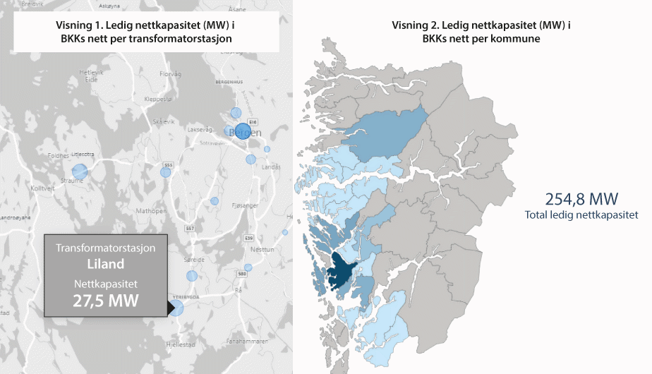For fullt ut å dra nytte av anleggsbidrag som lokaliseringssignal og redusere saksspesifikt veiledningsbehov for nettselskap, bør informasjon om nåværende og framtidig kapasitet for tilknytning tilgjengeliggjøres i større grad enn hva som er tilfelle i dag. En kartløsning tilsvarende det BKK Nett har publisert på sine nettsider (se boks 7.1) kan være godt egnet for dette formålet.