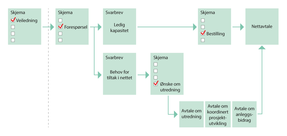 Forespørsel om tilknytning. Mindre/enkle tilknytninger kommer typisk inn til nettselskapet som installatørmelding. For større og mer komplekse tilknytninger er det ofte en mer uformell prosess innledningsvis, som gjerne starter med dialog via telefon, e-post eller møter. Typiske utfordringer knyttet til første forespørsel sett fra nettselskapets side, kan for eksempel være at henvendelse om tilknytning kommer sent i kundens utbyggingsfase, innholdet i første henvendelse kan være mangelfull, kunder etterspør mer kapasitet enn nødvendig, eller etterspør «all kapasitet», for å sikre seg.