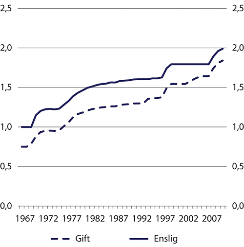 Figur 11.1 Minstepensjon til enslige og gifte (ordinær sats) som andel av grunnbeløpet 1967–2010. Årlig gjennomsnitt