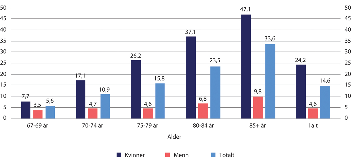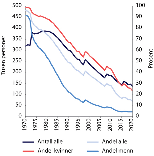 Andelen minstepensjonister har falt betydelig over tid, se avsnitt 11.3. Ved utgangen av 2021 var det 146 500 minstepensjonister, noe som tilsvarte 14,6 prosent av alderspensjonistene. Andelen minstepensjonister er klart høyest blant de eldste pensjonistene, og det er langt flere kvinner enn menn blant minstepensjonistene. Samlet var nesten 15 prosent av kvinnene minstepensjonister, mens andelen blant menn var under fem prosent.