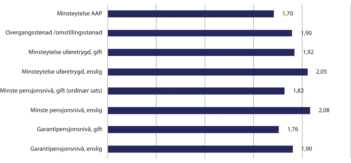 1) Hensynet til å sikre gode levekår for de svakeste i samfunnet har bred politisk oppslutning, uavhengig av synet på forskjeller i levekår i samfunnet.11 Nivåene på minstesikringen i folketrygden på ulike ytelser er da viktig.