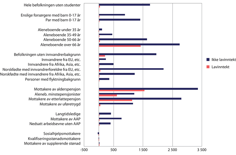 4) Inntekter og formue påvirker adgangen til markedsbaserte varer og tjenester. Gode levekår er avhengig av mer enn det. En velferdsstat av skandinavisk type kjennetegnes av et stort omfang av universelle offentlige tjenester, som i stor grad leveres gratis eller med lav egenandel. Det dreier seg både om utdannings- og helsetjenester som i stor grad leveres kostnadsfritt til personer med både høye og lave inntekter. Forskjeller i inntekt som kan brukes til å kjøpe varer og tjenester i et marked, motvirkes bevisst i den norske velferdsstaten ved at markedets betydning på viktige områder begrenses.12,13 I tillegg er det tjenester og ytelser som spesielt er utformet slik at de letter tilgangen for pensjonister med lave inntekter. Nivået på minstesikringen bør dermed blant annet ses i sammenheng med kravet til betaling for slike tjenester, se boks 11.1.