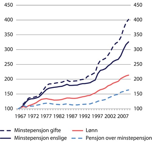 Den samlede effekten av reguleringen av pensjoner i de 43 årene fra 1967 til 2010 er illustrert i figur 11.2. Mens reallønningene økte med 114 prosent i perioden, hadde pensjoner over minstepensjon en reell økning på 64 prosent. Realverdien av minstepensjonen for enslige økte med 226 prosent, mens minstepensjonen for gifte økte med 302 prosent. I 2010 utgjorde minstepensjonen for enslige 34,1 prosent av en brutto gjennomsnittslønn, mens det tilsvarende tallet for gifte var 31,6 prosent. Etter skatt var kompensasjonsgraden 46,9 prosent for enslige og 43,3 prosent for gifte.