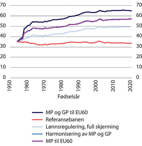 Økningen av minsteytelsene i alternativet med økte aldersgrenser vil i begrenset grad påvirke utgiftene til alderspensjon. Det skyldes at full minsteytelse først kan tas ut fra en høyere alder enn i referansebanen og dermed skal utbetales i en kortere periode. Å regulere minsteytelsene med lønnsveksten vil imidlertid øke utgiftene relativt mye: I 2060 øker pensjonsutgiftene med 11,7 mrd. kroner sammenliknet med alternativet «økte aldersgrenser», mens økningen i 2080 er på 19,6 mrd. kroner. Økningen i netto skattesats, jf. avsnitt 9.6.1, er på 0,3 prosentpoeng i 2060 og 0,5 prosentpoeng i 2080.