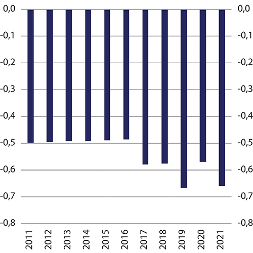 2016–2021 | 0,7 | -0,2 | 1,7 | 0,4 | -0,1 |