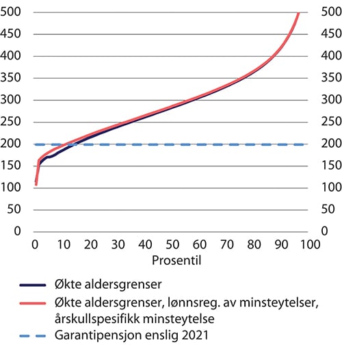 Årskullspesifikke minstenivåer vil bare ha betydning dersom minstenivåene ved normert pensjoneringsalder reguleres gunstigere enn løpende pensjoner. Kombinert med gunstigere regulering av utgangsnivåene, er årskullspesifikke minstenivåer ikke nødvendigvis til ugunst for dem med lavest pensjoner. Vi kan sammenlikne fordelingen av pensjonene i 2060 i alternativet med økte aldersgrenser med et alternativ der, i tillegg til økte aldersgrenser, minsteytelsene reguleres med lønnsveksten og der det er en årskullspesifikk minsteytelse. Figur 11.24 og figur 11.25 viser fordelingen av alderspensjonen i 2060 etter prosentiler blant henholdsvis arbeidsføre og uføre. I figurene er alderspensjonistene delt i 100 like store grupper, og figurene viser gjennomsnittlig alderspensjon i hver gruppe når de ordnes etter størrelsen på alderspensjonen. Det går fram at for både arbeidsføre og uføre så er pensjonsnivåene i de laveste prosentilene høyere med lønnsregulering av minsteytelsene og årkullspesifikke minsteytelser enn med bare økte aldersgrenser. Særlig gjelder dette for uføre. Reguleringen av utgangsnivåene for minsteytelsene er altså viktigere enn reguleringen av løpende pensjoner; om det er universelle minsteytelser.