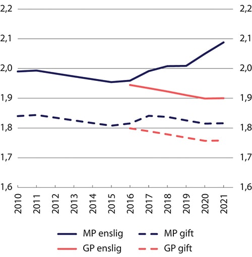 Figur 11.3 Minste pensjonsnivå (MP) og garantipensjon1 (GP) for enslige og gifte målt som andel av grunnbeløpet 2010–2021. Årlig gjennomsnitt