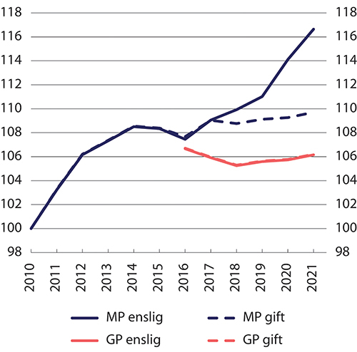 Figur 11.4 Realverdien1 av minste pensjonsnivå (MP) og garantipensjon (GP) for enslige og gifte. Indekser 2010=100