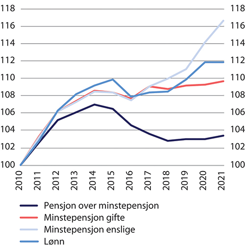 Figur 11.5 Realverdien1 av lønn, pensjon over minstenivået og minste pensjonsnivå 2010–2021. Indekser 2010=100