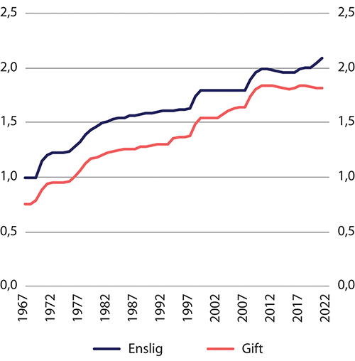 Figur 11.6 viser utviklingen i minstepensjon/minste pensjonsnivå i hele perioden 1967–2021. Vi ser at de årlige endringene etter 2010 er relativt små sammenliknet med enkelte år i perioden 1967–2010. Særlig økningen av særtillegget i 1998 gav en stor økning da minstepensjonen som andel av G økte med henholdsvis 10 og 12 prosent for gifte og enslige. Økningen i særtillegget i årene 2007–2010 gav et tilsvarende løft på 12 prosent, men da med en opptrapping over en treårsperiode. I perioden 2002–2005 ble grunnpensjonen for gifte økt fra 0,75 til 0,85 prosent av G, og forskjellen mellom minstenivået for gifte og enslige ble redusert, men denne forskjellen har senere økt som følge av økt sats for minste pensjonsnivå for enslige. Fra 1. juli 2021 er minste pensjonsnivå for et ektepar 172 prosent av særskilt sats enslige.
