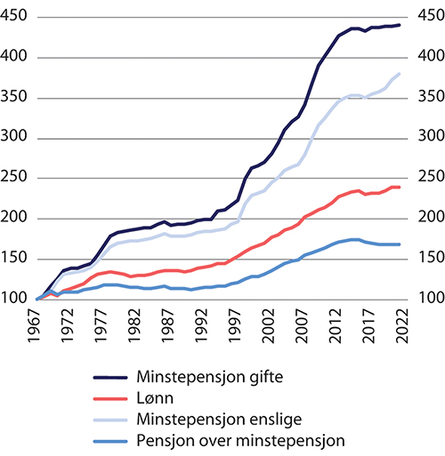 Det har vært en betydelig vekst i minsteytelsene siden 1967 sammenliknet med den alminnelige lønnsutviklingen, se avsnitt 11.2. Veksten var særlig sterk fram til 2011. Fra 2011 til 2021 har det relative nivået vært mer stabilt, men det har økt noe for enslige mot slutten av perioden. Minstenivåene i pensjonssystemet har økt mer enn lønningene og den alminnelige velstandsutviklingen i samfunnet. Minstepensjonen som andel av lønnsnivået er høyt i Norge sammenliknet med andre land, særlig etter skatt.
