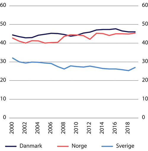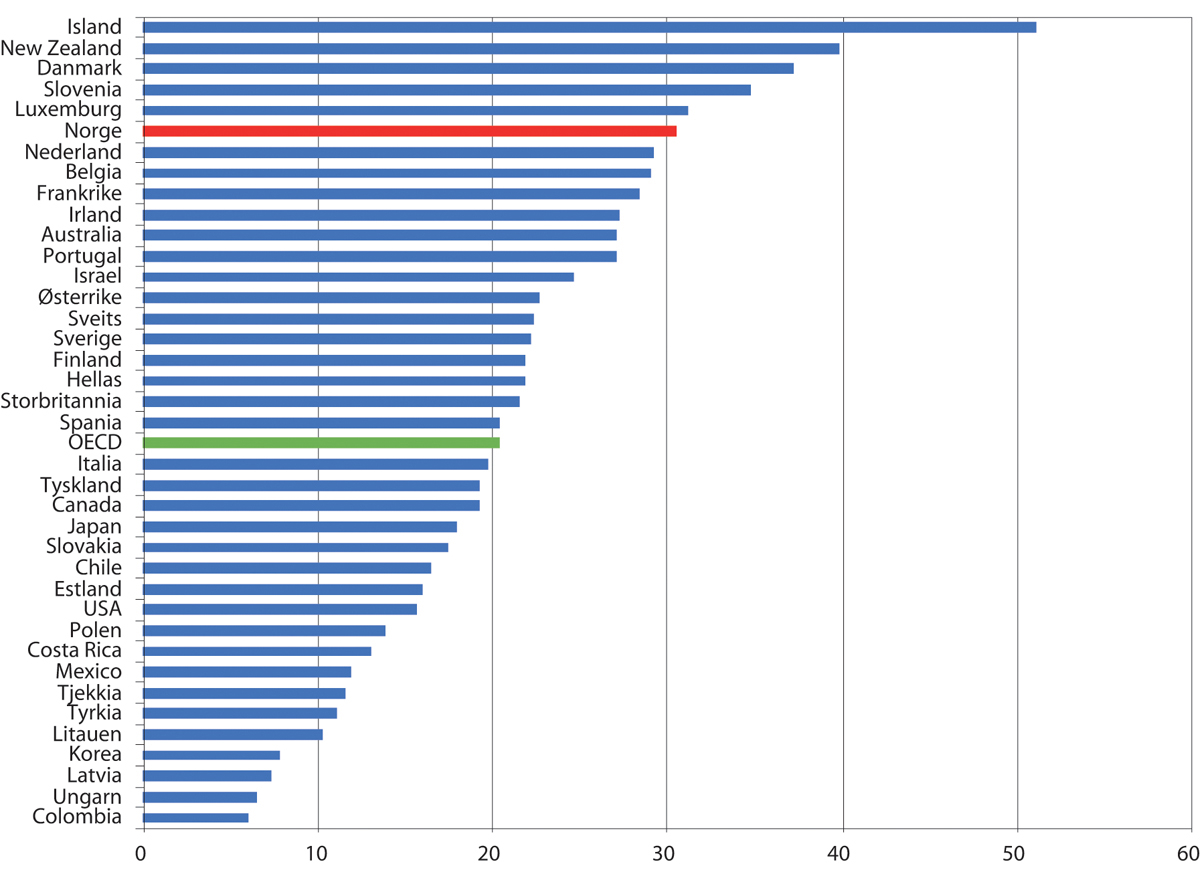 Hovedbildet er at det har vært en betydelig vekst i minsteytelsene over tid sammenliknet med den alminnelige lønnsutviklingen, særlig fram til 2011. Fra 2011 og fram til i dag har det relative nivået vært mer stabilt, men det har økt noe for enslige mot slutten av perioden, jf. figur 11.6. Den historiske utviklingen i Norge har vært at minstenivåene i pensjonssystemet har økt mer enn lønningene og dermed den alminnelige velstandsutviklingen i samfunnet. En internasjonal sammenlikning viser at nivået på minstepensjonen i Norge er høyt, jf. figur 11.8.