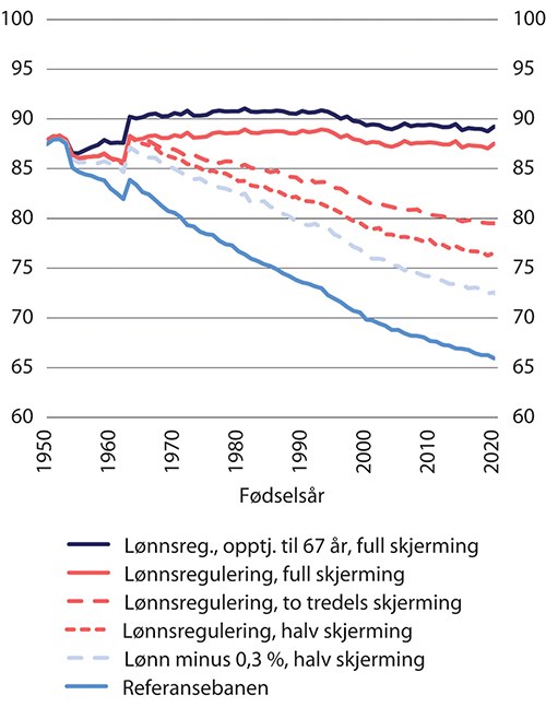 Sammenliknet med økte aldersgrenser og to tredels/halv skjerming, øker det gjennomsnittlige pensjonsnivået fra 1963-kullet med om lag 3–4 prosent dersom opptjeningsalderen økes til 65 år og med om lag seks prosent dersom opptjeningsalderen økes til 67 år, og effekten er marginalt sterkere ved to tredels skjerming. At økningen ikke er større, skyldes blant annet at mange uføre – i likhet med mange arbeidsføre – er i avkortingsintervallet for garantipensjonen, og de får dermed ikke full uttelling for den økte opptjeningen av inntektspensjon. Dette er dessuten en medvirkende årsak til at ytelsesnivåene faller noe over tid. Den viktigste årsaken er likevel at de uføre bare delvis skjermes for effekten av levealdersjusteringen. En årsak er også at sammensetningen av de uføre endres ved at det, i tråd med utviklingen de siste årene, er forutsatt at flere blir uføre tidligere i livet og dermed får et lavere opptjeningsgrunnlag for alderspensjon. Den gjennomsnittlige årlige reduksjonen fra 1963- til 2020-kullet er på 0,1 prosent i faste lønninger, uavhengig av om 1963-kullet har opptjening til 65 år eller til 67 år i ny opptjeningsmodell for alderspensjon.