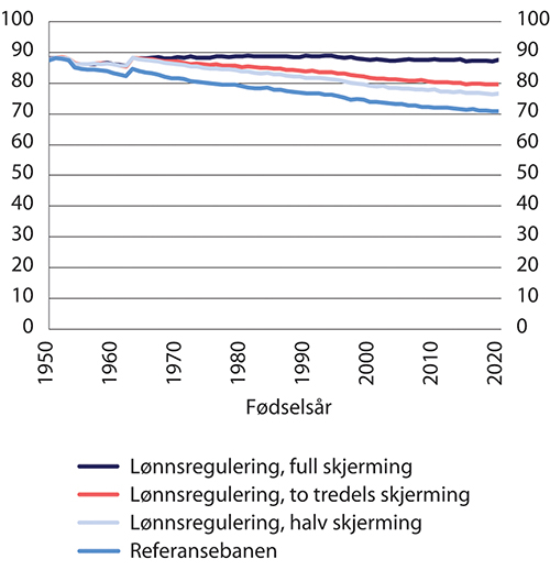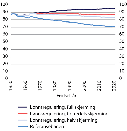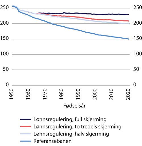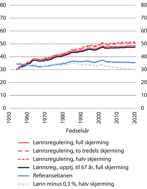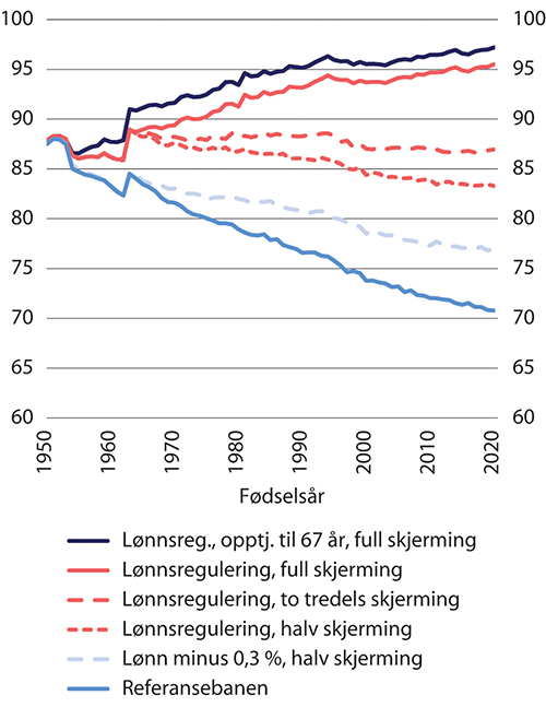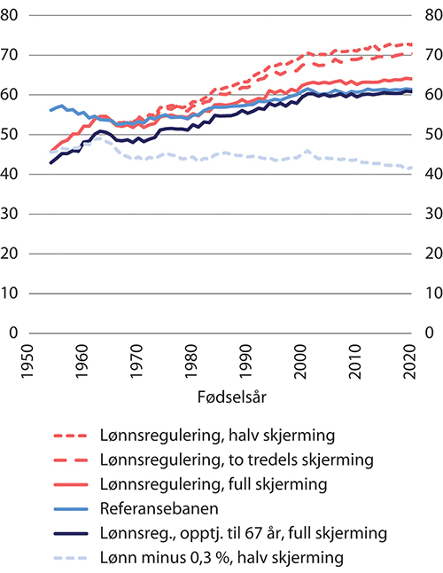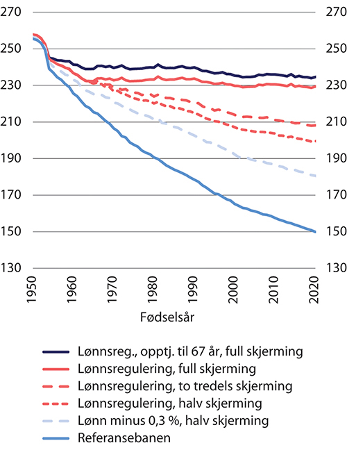 Referansebanen, lønnsregulering av minsteytelser, full skjerming av uføre | Som referansebanen, men full skjerming av uføres alderspensjon for virkningen av levealdersjustering fra 1964-kullet og satsene for minsteytelsene reguleres i takt med lønnsveksten. |