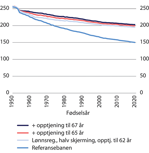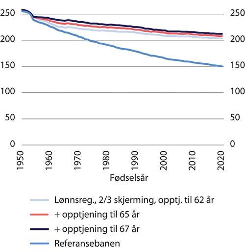 Ingen pensjonsreform | Referansebanen | Referansebanen, lønnsregulering av minsteytelser, full skjerming uføre | Økte aldersgrenser | Økte aldersgrenser, lønnsregulering av minsteytelser | |