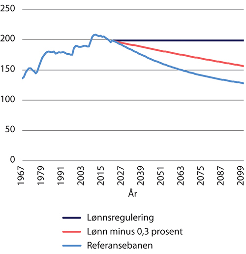 Å regulere minsteytelsene ved den normerte pensjonsalderen med lønnsvekst fratrukket 0,3 prosent i stedet for med lønnsveksten, vil isolert sett gi en innsparing på om lag ni mrd. kroner i 2060 og 16 mrd. kroner i 2080. Det vil innebære at minsteytelsene reguleres gunstigere enn med dagens regler, jf. figur 14.7, men vil ikke følge opp prinsippet om at minstenivåene bør utvikle seg i takt med den generelle velstandsutviklingen, operasjonalisert ved lønnsveksten.