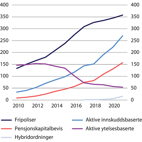 Selv om innskuddsordningene nå har klart flest aktive medlemmer, domineres både forsikringsforpliktelsene (opptjente rettigheter) og utbetalingene fortsatt av ytelsesordningene. Figur 3.1 viser utviklingen i forsikringsforpliktelsene fra 2010 til 2021. De samlede forpliktelsene er beregnet til 854 milliarder kroner ved utgangen av 2021, og av dette var 42 prosent i fripoliser, mens bare seks prosent var i aktive ytelsesbaserte ordninger. Veksten de siste årene har vært klart sterkest i forpliktelsene i aktive innskuddsordninger og pensjonskapitalbevis, men også forpliktelsene i fripolisene har økt.
