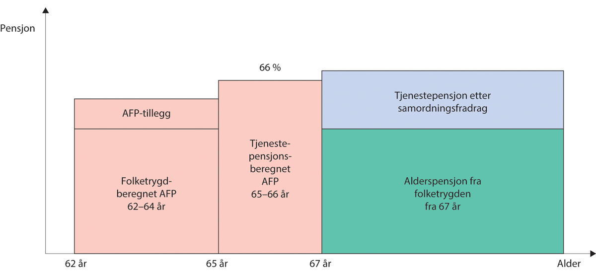 Pensjonssystemet i offentlig sektor før pensjonsreformen var som illustrert i figur 3.3: I alderen 62–66 år ble det utbetalt AFP som en tidligpensjon, mens offentlig tjenestepensjon først kom til utbetaling fra 67 år.
