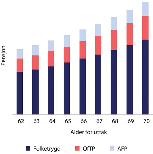 ‘Uttaksaldereffekten’ innebærer at årlig pensjon øker med om lag fem prosent dersom pensjonsuttaket utsettes med ett år. Dette gjelder dersom pensjonen tas ut i alderen 66–67 år for de som er født i siste halvdel av 1950-tallet. Ved utsatt uttak av alderspensjon vil det normalt tjenes opp ytterligere pensjonsrettigheter gjennom arbeid. Effekten av denne opptjeningen kommer i tillegg til uttaksaldereffekten og bidrar til å øke årlig pensjon. Totaleffekten av å både utsette pensjonsuttaket og avgangen fra arbeid med ett år er om lag 7,5 prosent høyere årlig inntektspensjon for en som har vært i arbeid i rundt 40 år.1
