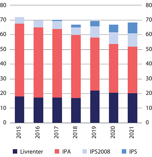 De samlede forsikringsforpliktelsene i individuelle pensjoner var 68 mrd. kroner ved utgangen av 2021. Figur 3.5 viser at forpliktelsene har vært relativt stabile siden 2015. Figuren viser også hvordan forpliktelsene er fordelt på ulike produkter. Det går fram at en stor del fortsatt er i IPA-ordningen (Individuell Pensjonsavtale) som ble avviklet i 2006. IPS 2008 er ordninger etablert i henhold til IPS-regelverket fra 2008, mens IPS er ordninger etter regelverket fra november 2017.