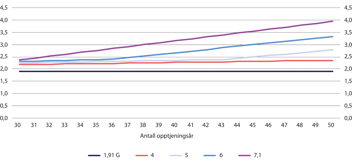 Figur 7.2 Årlig alderspensjon for enslig fra folketrygden (inntektspensjon og eventuell garantipensjon1 det første året ved uttak fra 67 år for ulike kombinasjoner av inntekt (4–7,1 G) og opptjeningsår (30–50 år). 1963-kullet. Pensjon i G